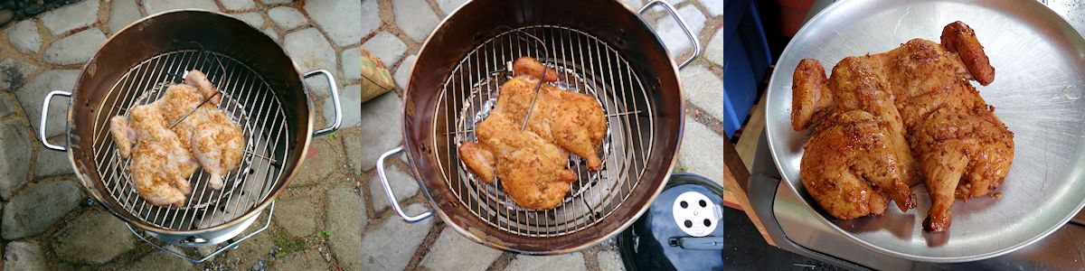 I spatchcocked a 2 1/2 pound frying chicken. See this link to find out about spatchcocking. It is just cutting out the backbone and breast bone so that the chicken lies flat.