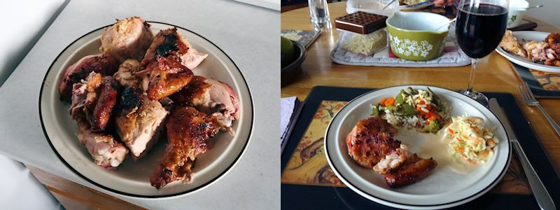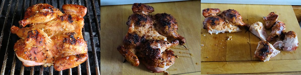 I put the chicken on my Weber Grill over high heat to crisp it a bit. Then I cut it into serving size pieces.