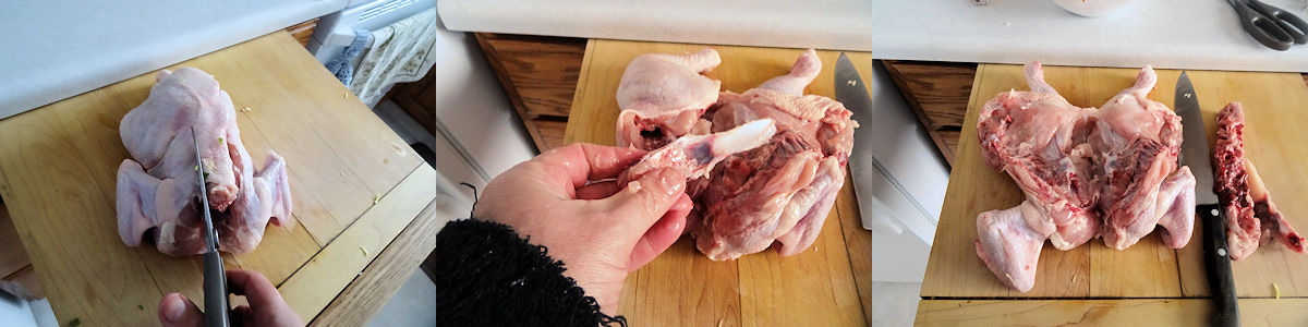 I spatchcocked the chicken. Spatchcocking means cutting the back bone off the chicken (save it for making stock) and then cutting out the breast bone so it lies flat. I spatchcock a chicken in video in my post on Rosemary Chicken.
