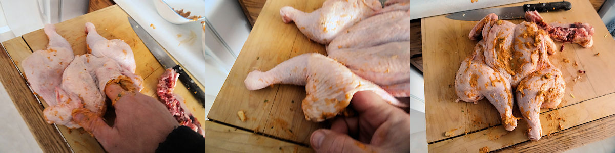 - Spatchcock the chicken by cutting the back bone out and removing the breast bone.