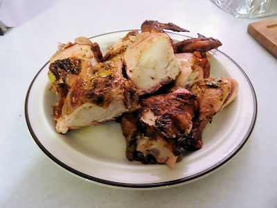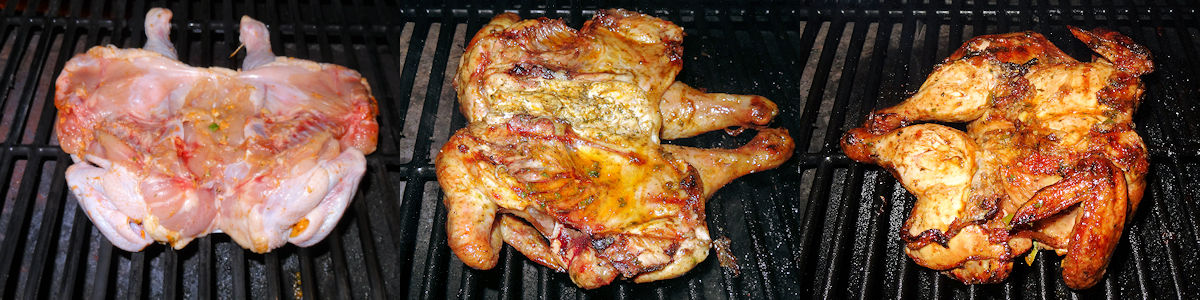 Here, I made a mistake. I always put my chicken on the grill with the skin side up for a while. If I put the skin side down right away, I have problems with some of the skin sticking no matter how much I oil the grill. I tossed this one skin side down. I figure the cold had killed my few remaining synapses. So, sorry, the skin isn’t perfect on this cook.