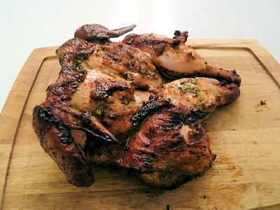 I smoked the chicken for 15 minutes. Then I brushed it with the liquefied paste. I continued cooking, brushing and turning every 15 minutes for an hour.