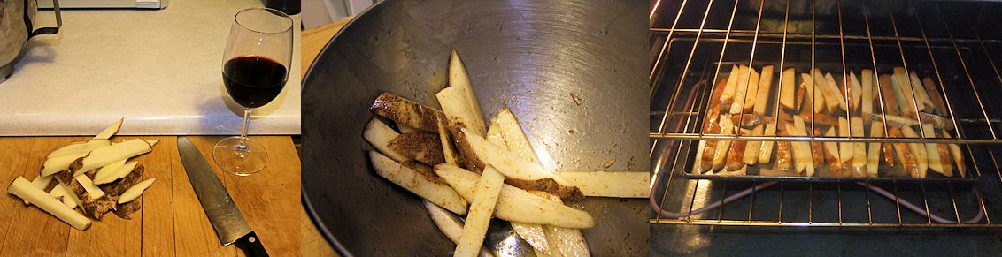 So, I oven fried some potatoes. It doesn’t take long. Just cut some potatoes into 3/8 inch sticks. Toss them with 1 1/2 tablespoons of olive oil for each baking size potato. You can add your favourite seasoning blend. I added a piri piri blend this time. It has a lot of flavour with a mellow heat that doesn’t kill you.