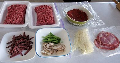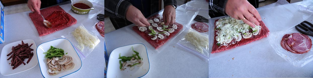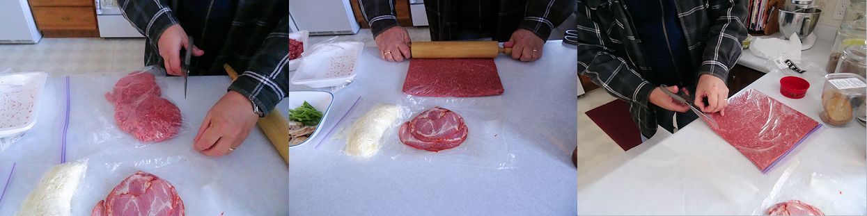 I put 2 pounds of ground beef in a one gallon Ziploc bag. I nipped the corners off to allow air to escape. I rolled the beef out to the shape of the bag with a rolling pin. I cut the sides of the bag and turned the beef onto a long sheet of wax paper.