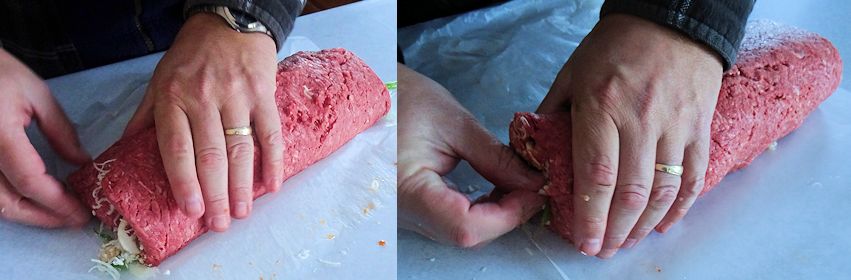 Using the wax paper to lift one end of the fatty with the wax paper, start rolling the meat like a jelly roll. Seal the seam and the ends.