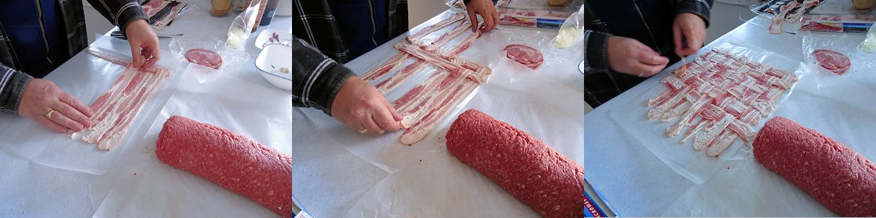 Then I made the bacon weave. Lay one strip of bacon on wax paper. Alternate the end of strips above and below that first strip. Fold over the strips that are underneath the first strip and lay a second cross strip. Flip the folded over bacon back and flop the alternate strips and lay another layer. Continue until you have a square weave.