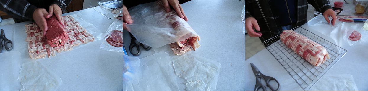 Put the fatty on the weave and, with the help of the waxpaper, wrap the fatty in the bacon. Try and get the seam of the weave and the fatty on the same side.