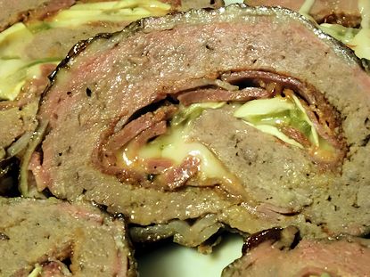 I spread the toppings on the beef leaving a space around the edges so it can be sealed after rolling.