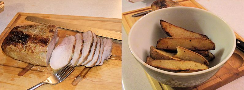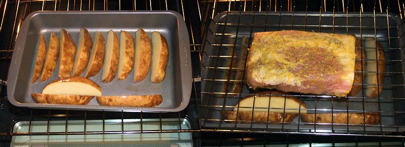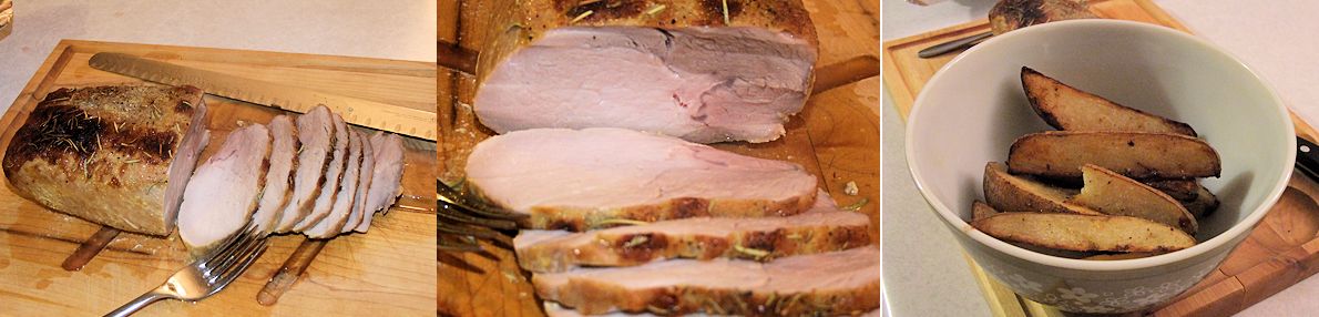 Every 15 minutes, I lifted the rack off, brushed the potatoes with canola oil and turned them. I put the pork back in and continued roasting. It took an hour and ten minutes (four brushings) to get the roast to an internal temperature of 150 F.
