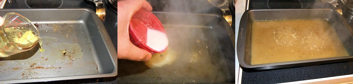I put the roasting pan over a range element on medium high heat and added 2 cups of chicken stock and 1 tablespoon of dried onion flakes to make up for the lack of flavour from the drippings from the roast. While it was coming to a boil, I mixed 2 tablespoons of flour with 3