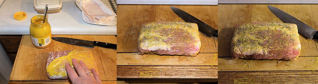 I rubbed a little mustard over the roast. I sprinkled it with salt, pepper, onion powder and garlic powder. I then pressed in some dried rosemary.