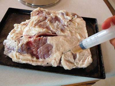 11. Take the brisket out of the brine and inject it every inch or so with brine.