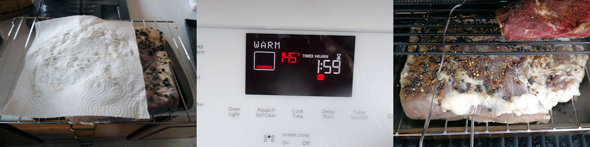 18. Unwrap the brisket and let dry on the counter for 2 hours patting with paper towel every 15 minutes or put in a 140-150 F oven for one hour.
