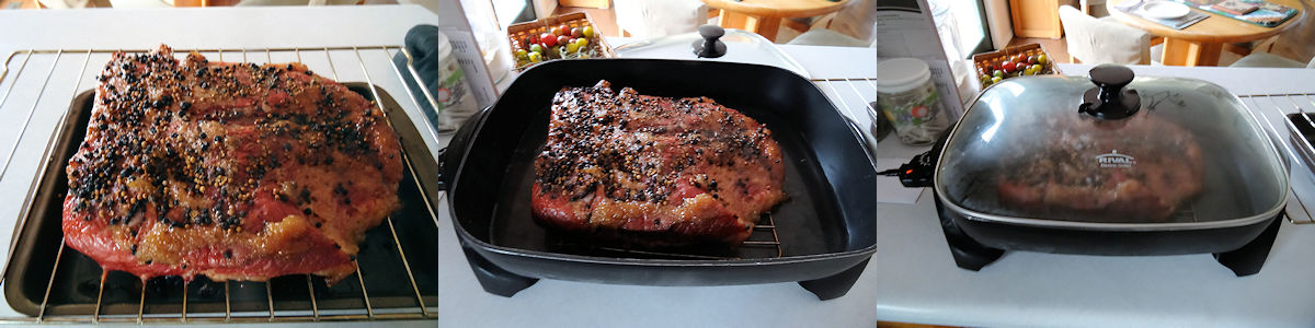 Put the brisket on the rack over the water. Bring the water to a low boil. Cover the pot and let the brisket steam for 3 hours. Make sure it doesn’t boil dry and add more boiling water if needed.