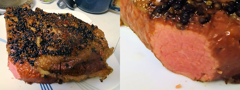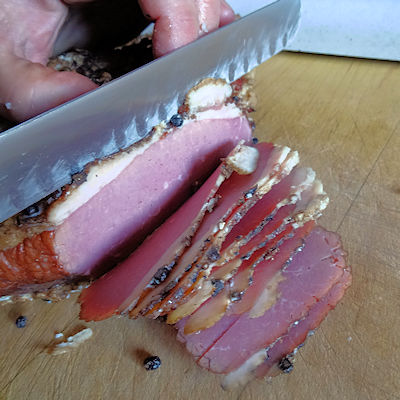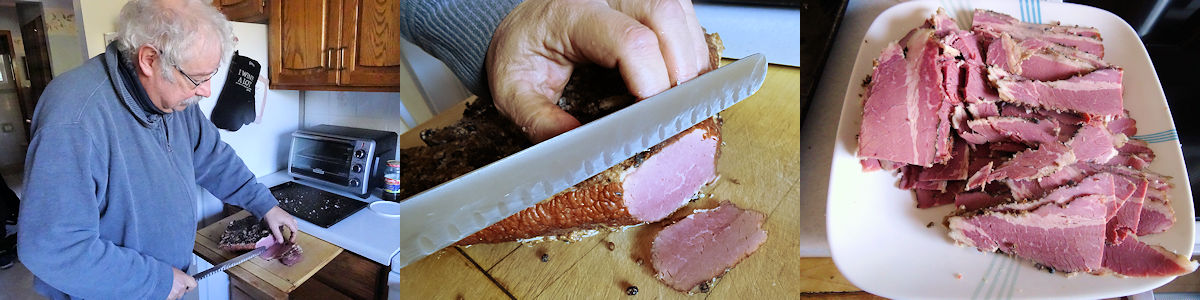 The pastrami is ready at this point. However, it is somewhat more difficult to cut hot pastrami thinly. So, I let my pastrami cool before slicing. Of course, I had to cut one corner off to try for quality review. I am only human.
