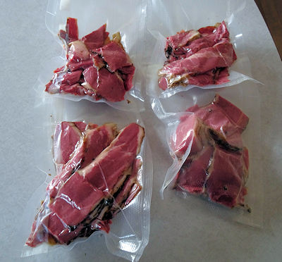 The rest of the pastrami I sealed in Foodsaver bags with my new Foodsaver system (I will be doing a review soon). By doing this, you can take the bags right out of the freezer and drop them in boiling water for hot pastrami any time you want it.