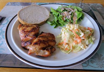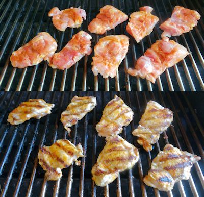 I knew from smoking that putting oil on the meat prior to applying a rub doesn’t do much to help stick the rub to the meat. It stays on fine by itself. However, when cooking over high heat, the oil improved the texture of the surface of the thighs. This is important because there is so little fat when the thighs are skinless. I also think they cooked to a nicer colour. The amount of oil is so small I am not worried about the extra fat. I will do this from now on when I want a fast food meal that is way better than any burger joint.
