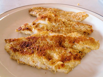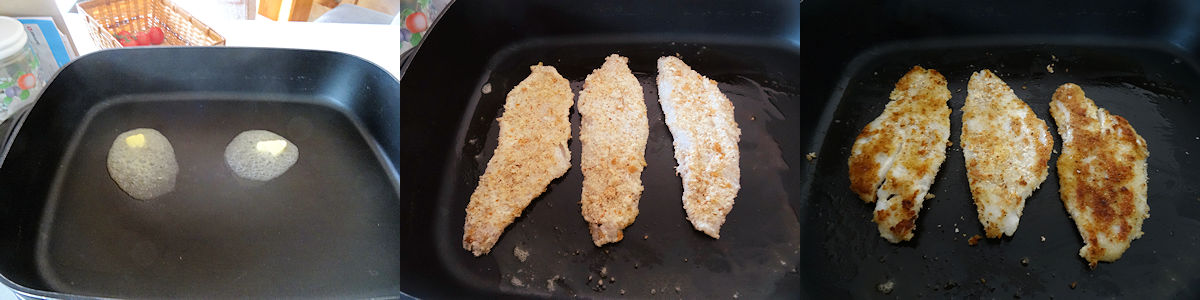 I preheated an electric fry pan to 400 F. When it was up to temperature I added butter. When it was bubbling, I put the sole in the butter and cooked it for about 3 minutes until the breading was browned and flipped them. I cooked for a couple of minutes more to brown the other side.