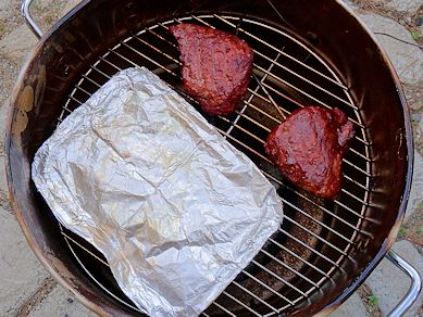 Put the tray on the upper rack of a gas barbecue set at medium high or in your smoker at about 350 F for an hour. Give the tray a shake once in a while.