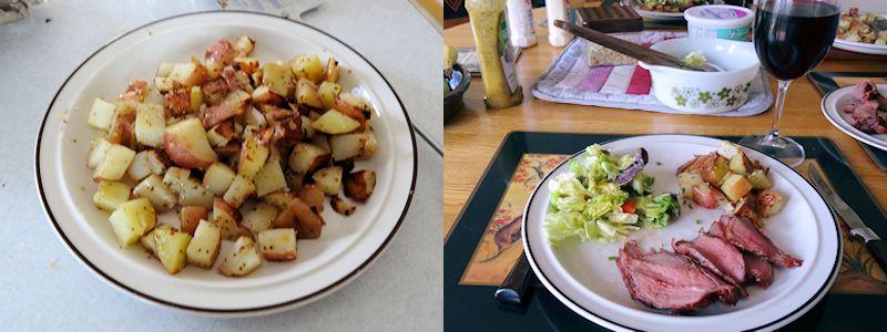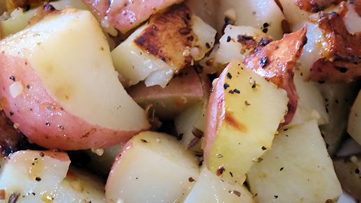 That is where a recipe like this comes in. Just scrub as many potatoes as you want and cube them. Toss them with some olive oil to just coat. Add a generous amount of you favourite seasoning blend. I used steak spice but you could use Italian, Cajun, Greek or any other seasoning blend you like.