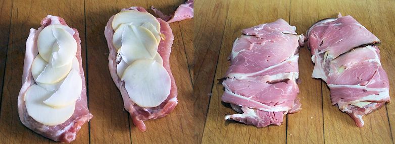 I started by placing the provolone on the pork chops. It is important that it be about 1/8 inch or so thick. I also keep it back from the edges of the chop. Then I wrapped the back bacon around the chop. I used home smoked provolone and back bacon but regular cheese and ham slices would work fine.