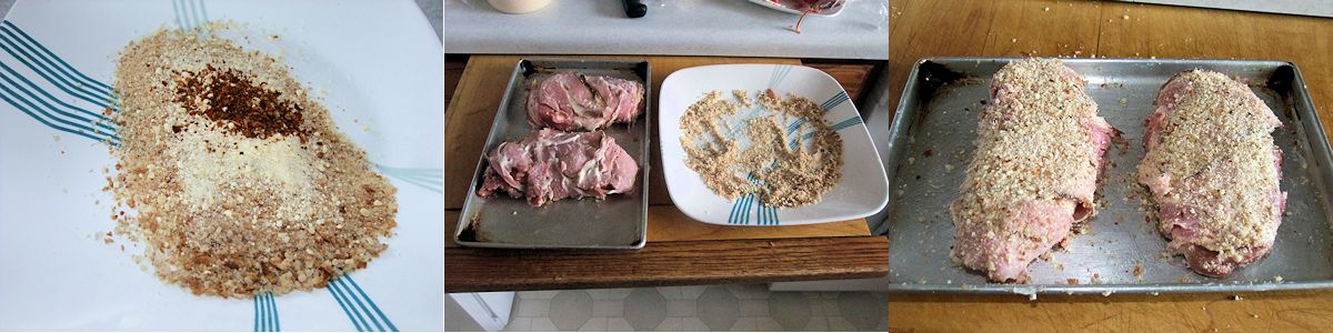 I mixed the bread crumbs with the Parmesan and Cajun seasonings. Then I turned the chops over and gave the bottoms a coating of mayonnaise and turned it back into the bread crumbs. I put the chops on a greased baking tray and put a layer of mayonnaise on the top. I then pressed the remaining bread crumbs on top of the wrapped chops.