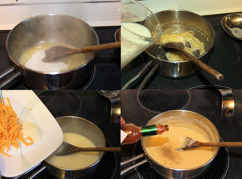 Start by making the Cheese sauce. Melt the 2 tablespoons butter in a sauce pan over medium heat. When it is melted, add the flour and stir until well blended. Gradually add the milk and stir until the mixture thickens. Add the cheeses and stir until melted. Add the salt, dry mustard, hot pepper sauce and black pepper. Stir until blended. Remove from heat and set aside.