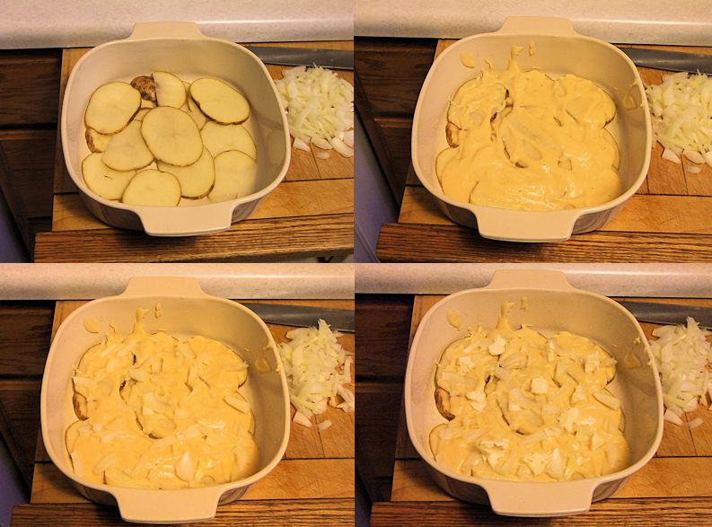 Now, start putting the casserole together. Put 1/3 of the potatoes in a greased 10 inch casserole. Put 1/3 of the cheese sauce over the potatoes. Sprinkle 1/3 of the onions over the sauce and dot the surface with one tablespoon of the butter.