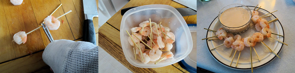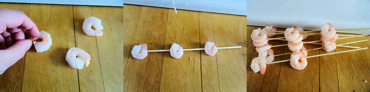 I took 24 medium cooked and shelled shrimp. I pulled the tails off the shrimp. I threaded 3 shrimp onto 8 inch bamboo skewers about 2 inches apart.