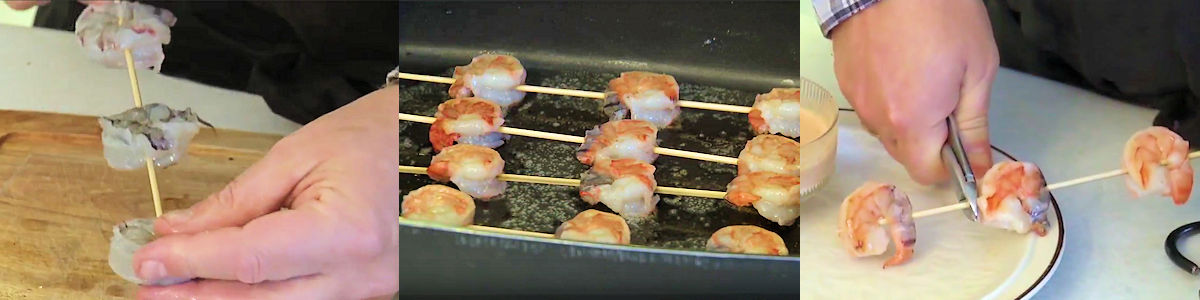 - Put 3 shrimp on each skewer, leaving 2 inches above each shrimp.