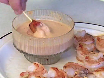 I am old enough to remember the days of the stodgy old steakhouses. They had white table cloths, huge hunks of beef and a standard set of appetizers and side dishes. One of the common dishes was Shrimp Louie, shrimp in a tasty pink sauce. It was a rich appetizer served in a chilled glass. I have updated it to a more modern version with shrimp on skewers to make them a finger food with a tasty dip.