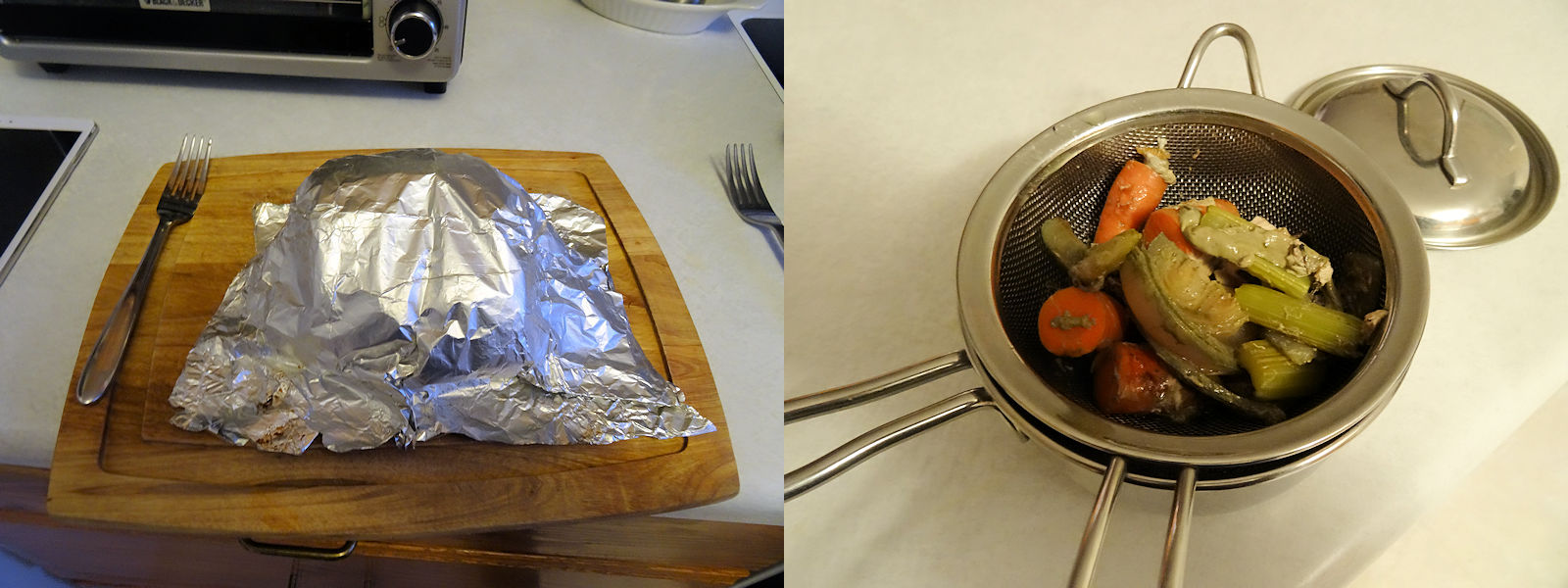 - Cut the carrot, celery and onion into chunks and put them in a roasting pan. Put the galic cloves in the roasting pan.