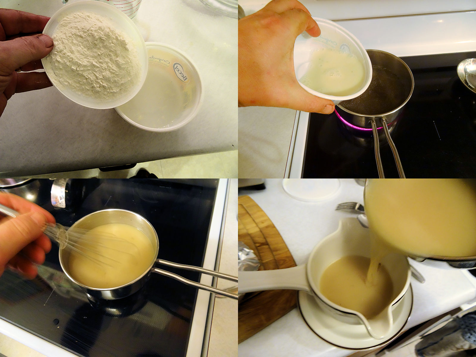 I put 125 ml (1/2 cup) of cold water in a sealable container and sprinkled 50 ml (1/4 cup) of flour over the water. I closed the container and shook for a couple of minutes until the flour was mixed and there were no lumps.