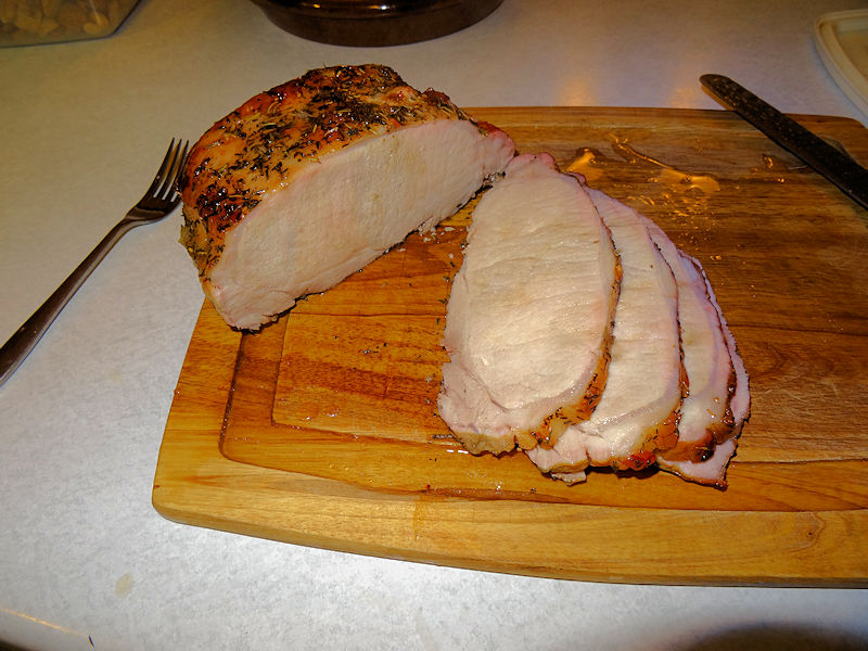 The lean loin roast was nice and moist, just like the oven version. The marinade gave a bit more complexity but the increased amount of soy injected did cause a bit of dark staining but not to an objectionable level. The touch of smoke also added to the flavour. The gravy was delicious.