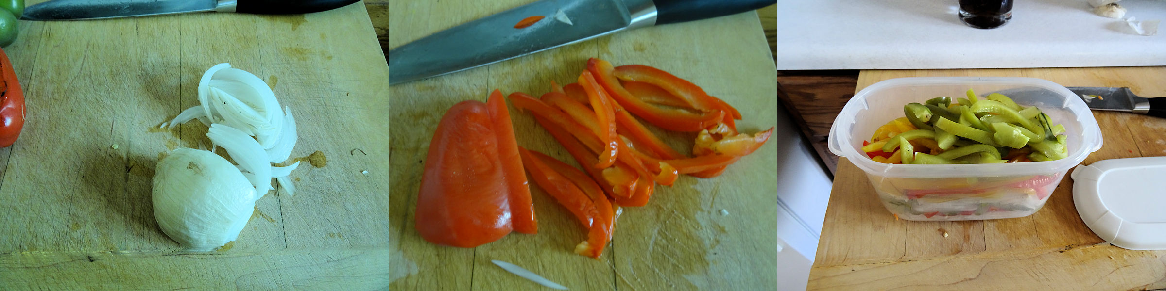 I cut one each red pepper, green pepper, and yellow pepper in half an removed the membranes and seeds. I cut a medium onion in half.