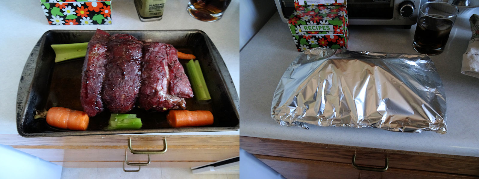 When the beef had smoked three to four hours and got some good colour. I put the beef in a roasting pan with a stalk of celery and a large carrot cut into chunks. I covered it with foil and put it back in the smoker, increasing the temperature to 250 F (121 C).