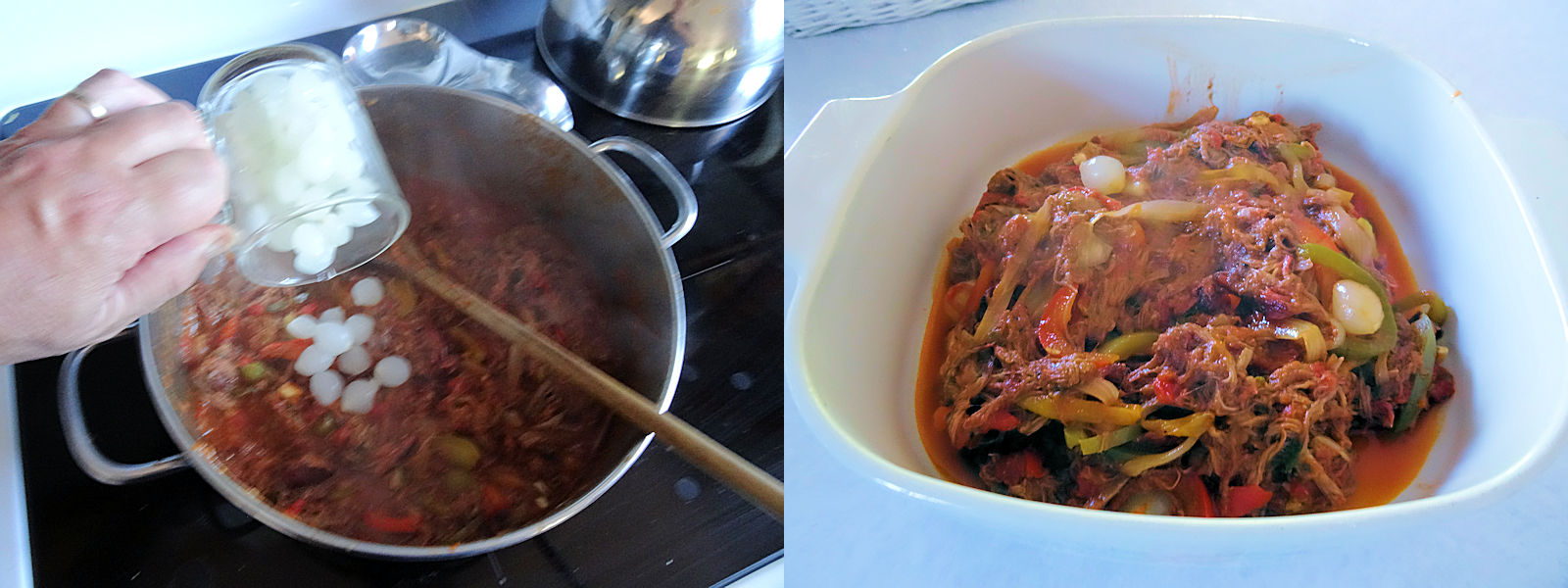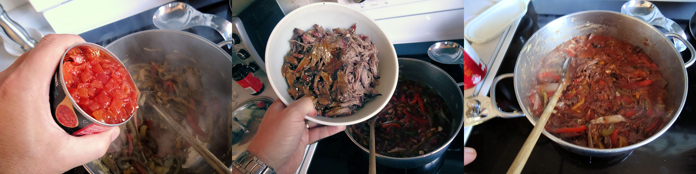 - Put the shredded beef, the liquid, the peppers, and the onions in a large pot. Add the garlic, allspice, cloves, oregano, ground pepper, white wine, beef broth, diced tomatoes, and bay leaves.