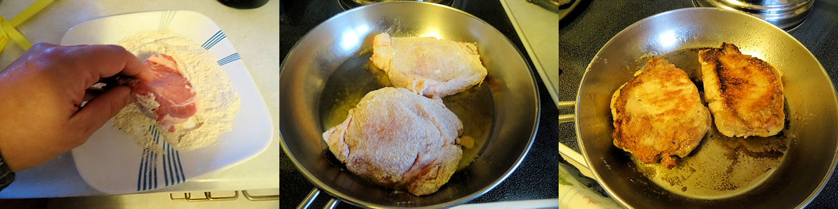 - Roll the pork chops in the flour mixture to coat. Save the excess flour mixture for later use.
