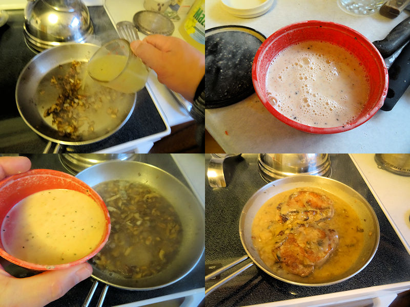 Add the chicken broth. Put the left over flour mixture in a container with a lid that seals. Add the cold water. Shake until well mixed. Stir the flour mixture into the hot broth and stir until it thickens. Put the chops back in the sauce and cover. Lower the heat and simmer for 1 hour.