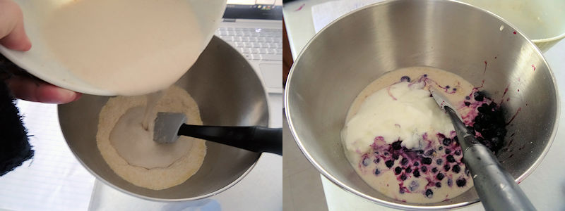 - Pour the sourdough mixture into the flour mixture all at once and stir just to moisten.