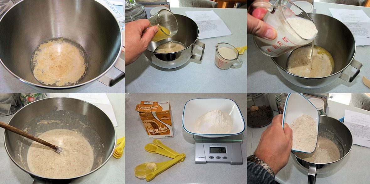 I put the yeast in the warm water and let it soften for 10 minutes. I added 2 cups of flour, the sourdough starter, sugar, butter, and salt. I stirred this until mostly smooth. I mixed the baking soda with a cup of flour. I stirred this into the mixture.