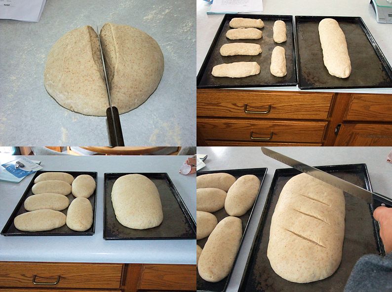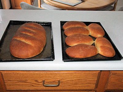 I then made another change. The recipe calls for cutting the dough in half and making two long loaves. I made one long loaf and six more smaller hoagie style loaves for sandwiches. These are covered and allowed to rise for an hour until doubled in size. Diagonal slices are