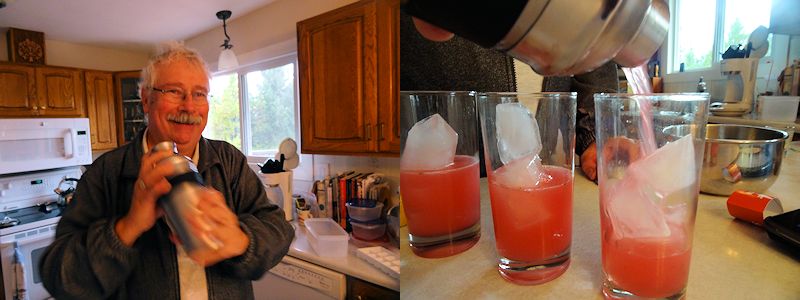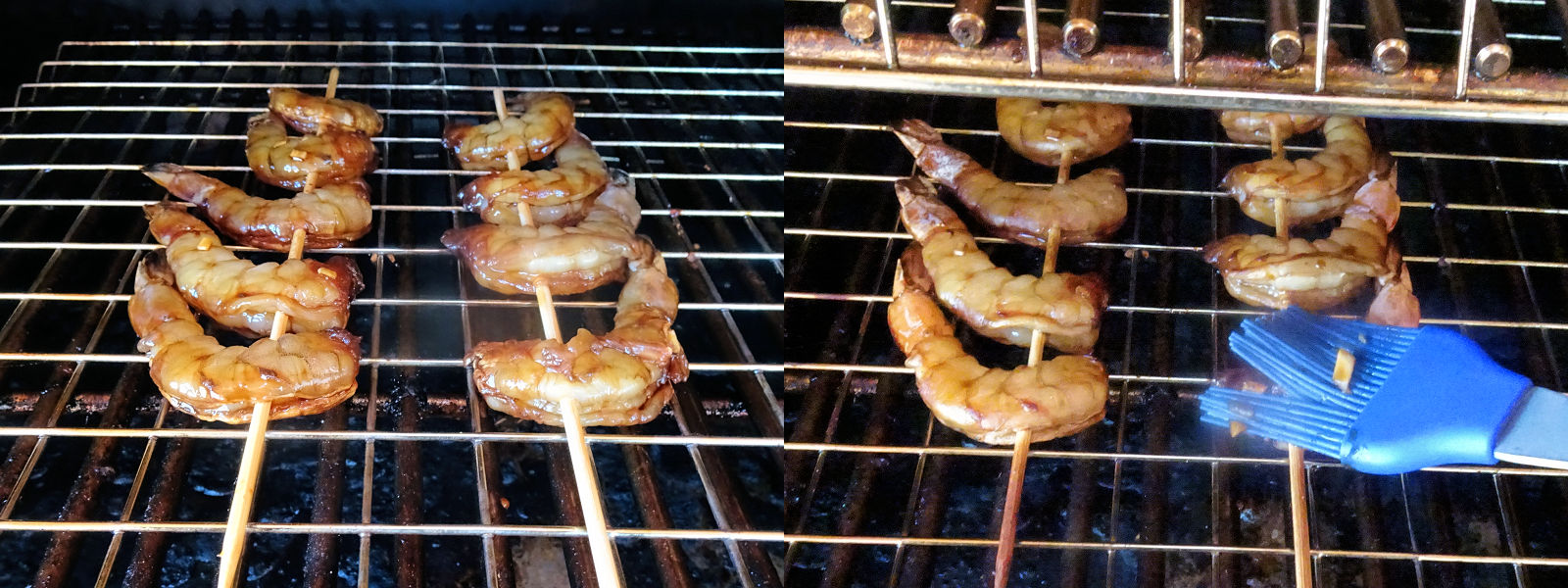 My Traeger Timberline smoker was already preheated to 425 F (218 C) for the chicken wings so I skewered 5 prawns each onto two bamboo skewers and put the prawns in the smoker. I cooked them for 4 minutes then brushed them with the marinade. I turned them and cooked for 3 minutes more.