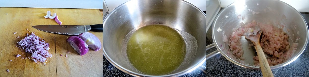 I started by chopping the onion and garlic. Then I heated the vegetable oil in a saucepan over medium heat. Then I added the onion to the oil and cooked for about 4 minutes until the onion started to soften.