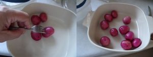I use small new potatoes from my garden to make these. You can use larger potatoes but they won’t take the flavour like smaller ones. Also, I prefer waxier type potatoes for this. I use Norland but Yukon Gold or any other thin skinned potato works well.