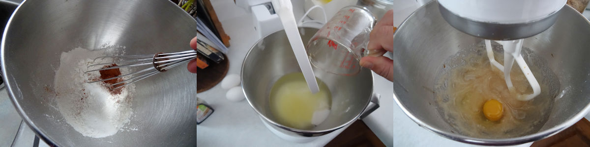 You put the sugar and oil in a bowl and mix them. Add the egg an vanilla and beat well.
