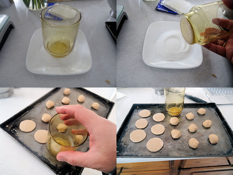 - Dip the glass in the sugar and press a cookie ball to about 3/16 inch thick with the sugar coated glass bottom. Dip the glass in the sugar and press the next cookie. Press all the cookies flat.