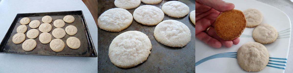 Roll the dough into 1/2 inch balls and put them 2 inches apart on cookie sheets sprayed with baking spray. Put sugar on a small plate. Grease the bottom of a drinking tumbler with butter. Dip the glass into the sugar and press a ball to about 3/16 inch thick with the glass. Dip in the sugar again and flatten the next cookie. Continue until all the cookies are pressed flat.