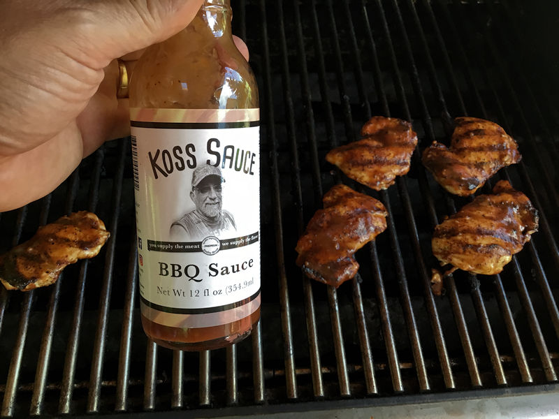 I turned by Weber Genesis gas grill on high to preheat. I sprinkled some Bub ‘n Mutha’s rub on the thighs. I put them on the grill over high and brushed a nice layer of Koss Sauce over the top. I cooked for 4 minutes and flipped the thighs and brushed more sauce over them and cooked to an internal temperature of 170 F which only took a couple of minutes.