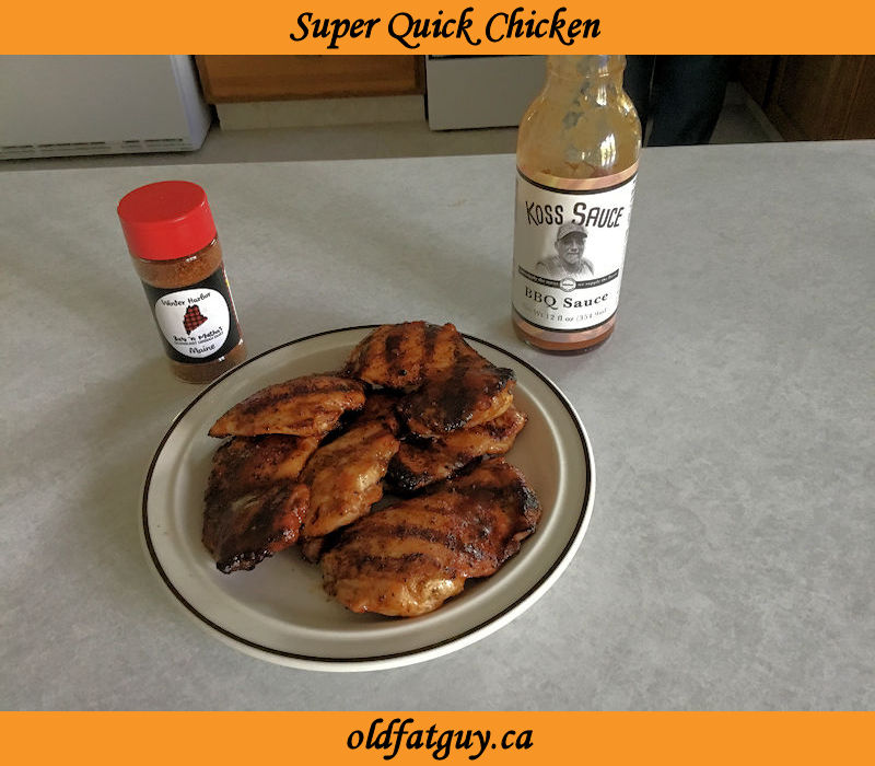 I had some boneless skinless chicken thigh. They are thin and cook quickly on my barbecue while the dark meat is moister and more flavourful than breast meat.